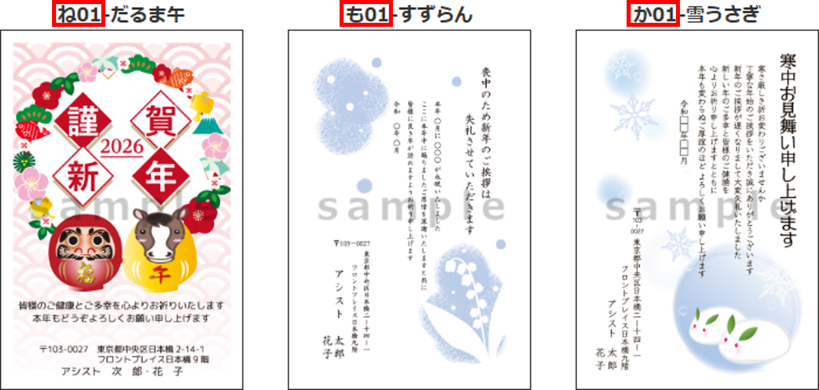「年賀状」「喪中・寒中見舞い」ページよりお好きなデザインを選択してください。